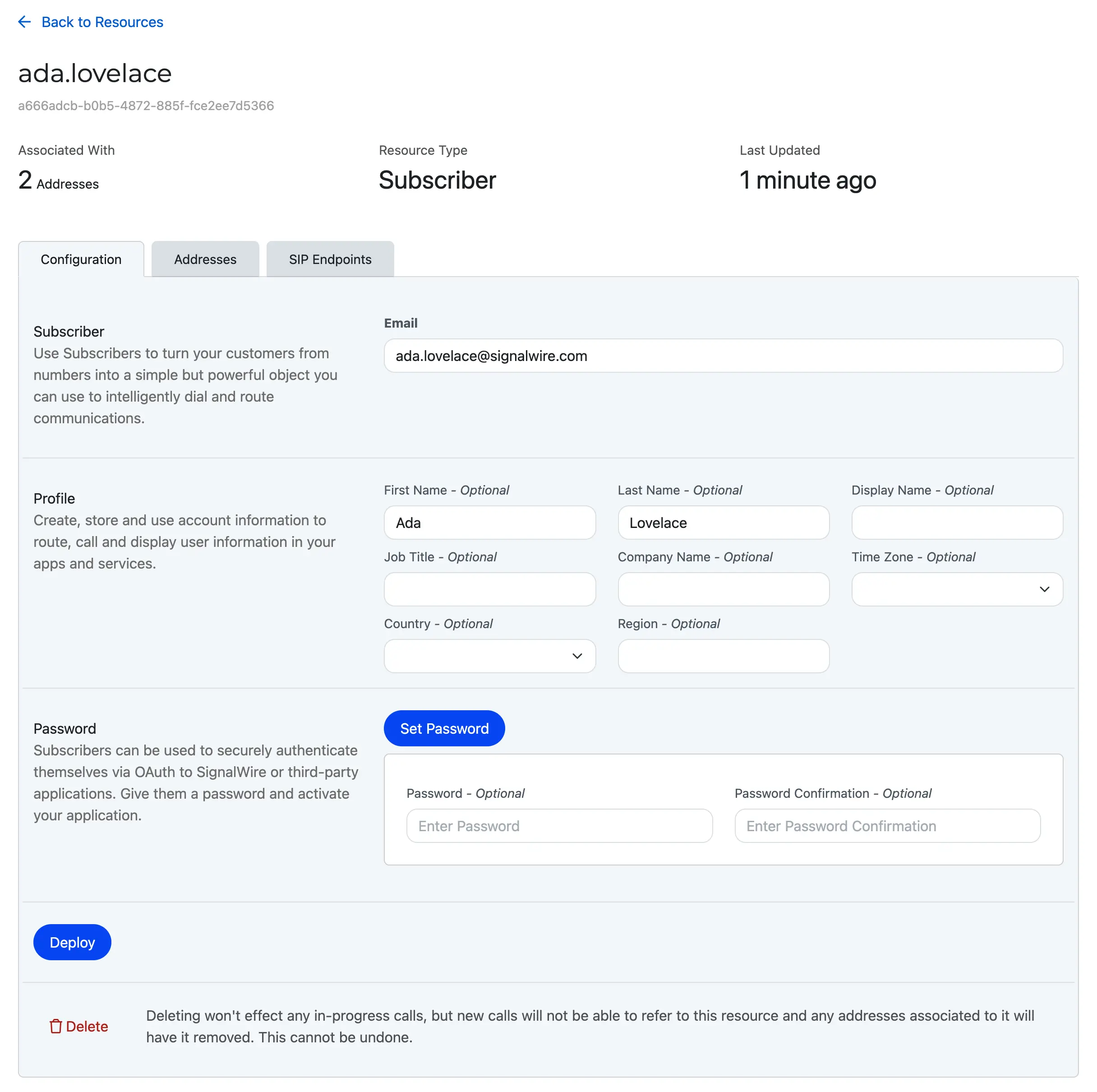 Viewing details for a Subscriber in the Resources tab of the SignalWire Dashboard.