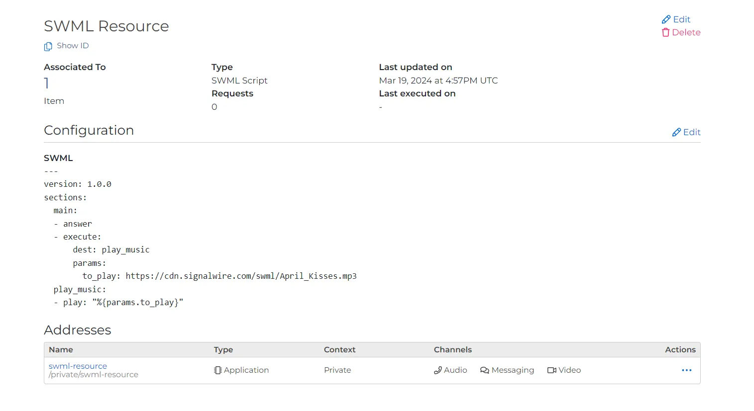 The SWML Resource type is used to create and manage SWML scripts. SWML allows you to write Relay applications using simple statements in a YAML or JSON document.